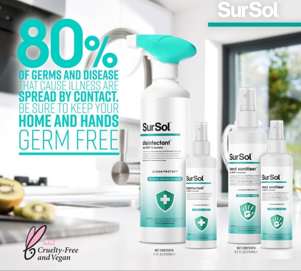Safe and kind Non-Alcoholic Surface Disinfectant. Sursol ensures it keeps your surfaces free of germs and viruses but ensures it keeps your family safe, unlike purely alcohol based products. Sursol is so much less corrosive on your surfaces and safer for children due to the fact it's non-alcohol based, but still highly effective at killing known germs and viruses.